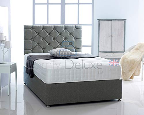 Comfy Deluxe LTD 4FT6 Double Bed Set with Memory Spring Mattress - Grey Chenille Divan Bed Frame with stylish 26" Chesterfield Headboard, Chrome Glider Feet & No Storage - UK Made