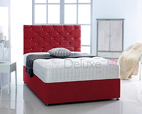 Comfy Deluxe LTD 4FT6 Double Bed Set with Memory Spring Mattress - Red Chenille Divan Bed Frame with stylish 26" Chesterfield Headboard, Chrome Glider Feet & No Storage - UK Made
