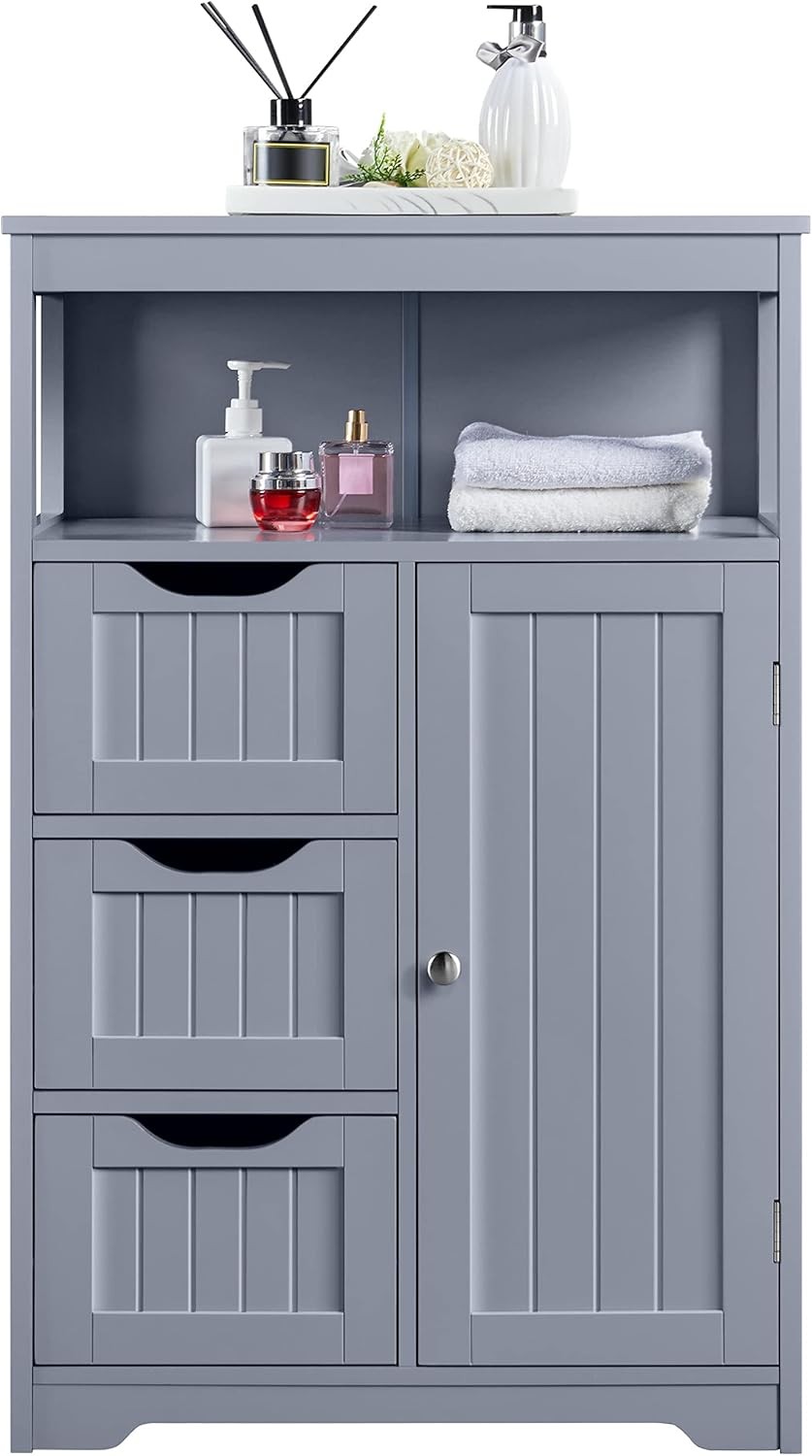 Yaheetech Bathroom Storage Units with Open Storage Shelf Free-standing Floor Cabinets Sideboard with 3 Drawers and 1 Door, Adjustable Shelf for Living Room Kitchen Entryway Gray