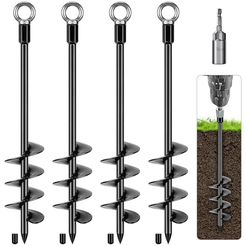 BeneLabel Tent Peg Heavy Duty, 47cm Ground Anchor Screw Trampoline Stake 4pcs Metal Earth Sand Spiral Wind Storm Spike for Swing/Camping/Shed/Dog/Carport/Canopy with Fixed Ring, Black