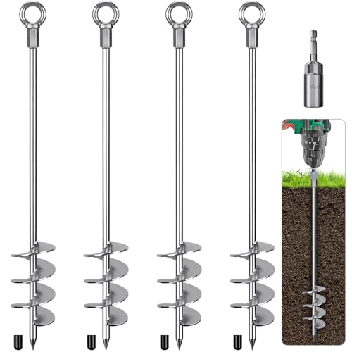 BeneLabel Tent Peg Heavy Duty, 47cm Ground Anchor Screw Trampoline Stake 4pcs Metal Earth Sand Spiral Wind Storm Spike for Swing/Camping/Shed/Dog/Carport/Canopy with Fixed Ring, Silver