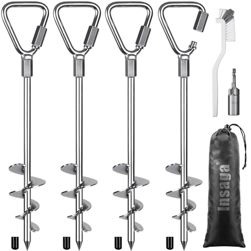 Insaga Ground Anchor, 4pcs Heavy Duty Tent Peg Trampoline Earth Stake Strong Storm Spiral Screw Spike for Garden Swing/Camping/Canopy/Shed/Dog/Carport with Carabiner Lockset, Inverted Triangle/44cm