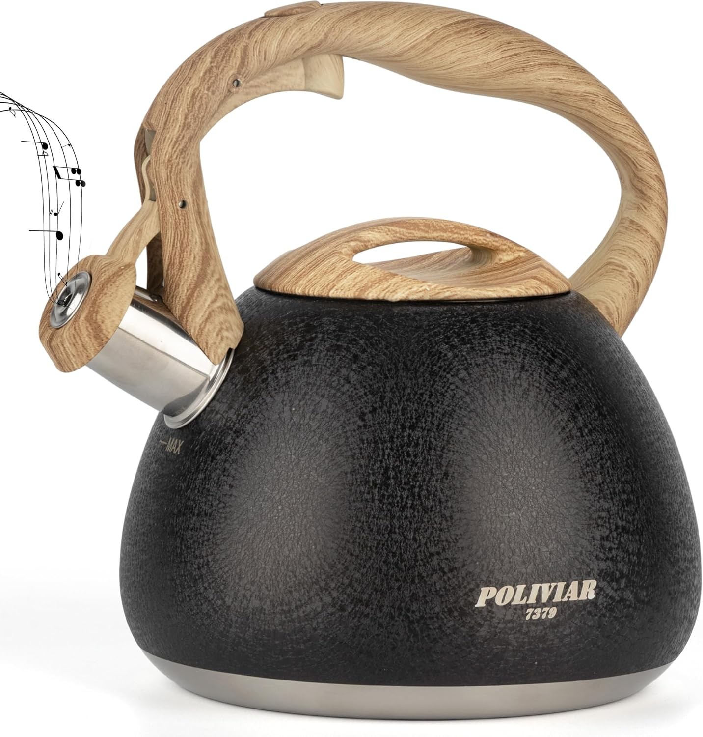 POLIVIAR Stove Top Kettle, Black Stovetop Kettle 2.7 L, Audible Whistling Kettl
