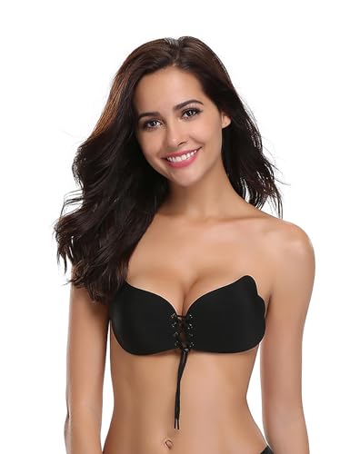 comeondear Women's Invisible Adhesive Push Up Bras Reusable Backless Breathable Strapless Brassiere Sticky Front Closure Strap Bra Black