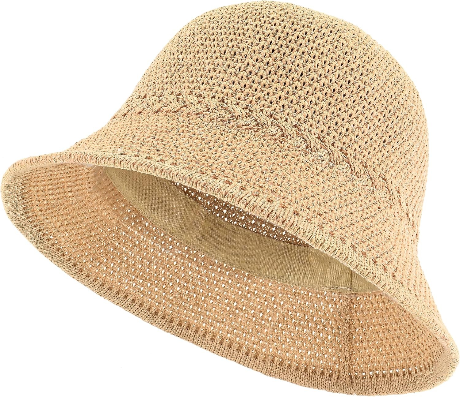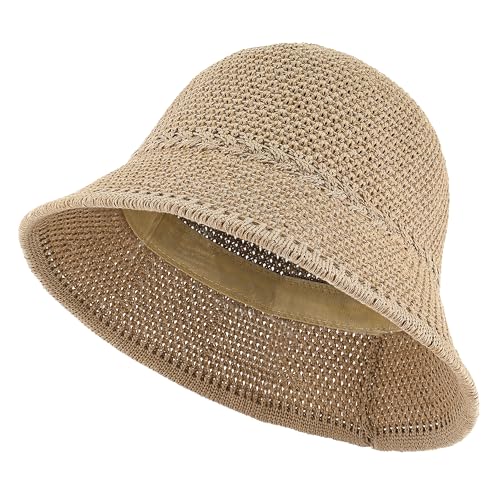 EINSKEY Women's Crochet Bucket Hat, Faux Straw Weaving Sun Hat Packable Mesh Woven Soft Lightweight Beach Hat for Spring Summer Fall Khaki