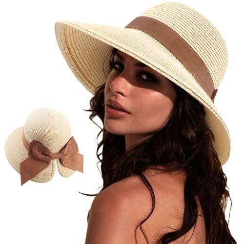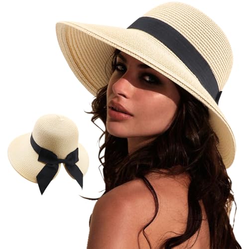 DRESHOW Sun Hats for Women Travel Fedora Foldable Beach Sun Hat Summer Wide Brim Straw Bucket Hat with Bowknot UPF 50+