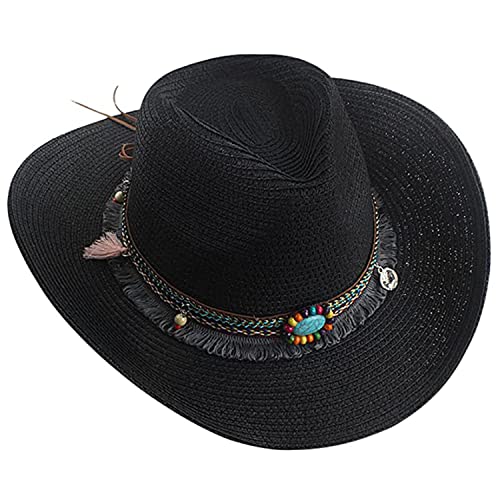 Unisex Cowboy Straw Hat Vintage Cowgirl Hat Classic Western Style Wide Brim Fedora Bucket Visor Cap Summer Beach Outdoor Sun Headwear with Decorative Hatband Black