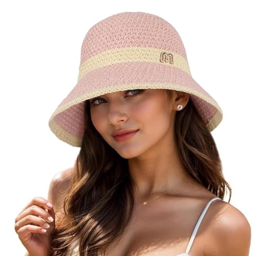 Women Straw Sun Hat - Summer Wide Brim Summer UV Protection Beach Hat Foldable Packable Crochet Bucket Hat for Outdoor Travel Pink
