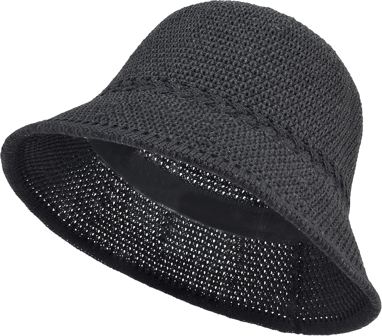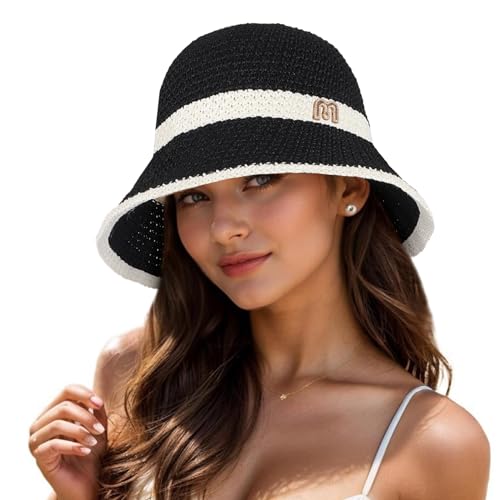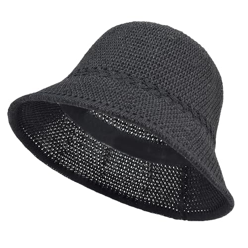 EINSKEY Women's Crochet Bucket Hat, Faux Straw Weaving Sun Hat Packable Mesh Woven Soft Lightweight Beach Hat for Spring Summer Fall Black