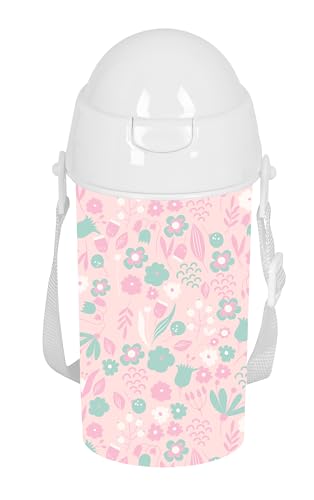 SAFTA PREESCOLAR FLORES – Automatic Opening Bottle, with Straw, Water Bottle, BPA-Free, with Shoulder Strap, Comfortable and Lightweight, 500 ml, 7.5 x 19.5 cm