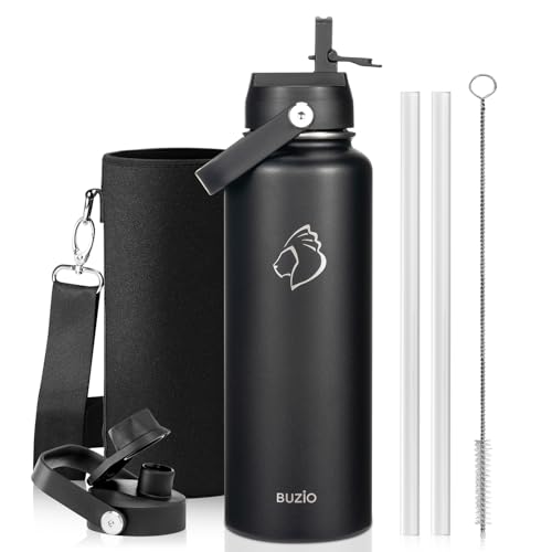 Stainless Steel Water Bottle with Straw, BUZIO Insulated Water Bottle with Straw Lid and Flex Cap 1180 ml Metal Water Bottle Cold for 48 Hrs, Hot for 24 Hrs Double Wall BPA Free Leak Proof, Black