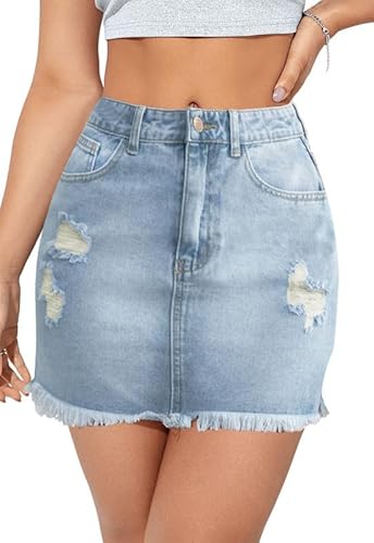 Alaster Queen Women's Denim Mini Skirt Stretch Ripped High Waist Bodycon Short Pockets Jean Skirts for Women, Light Blue XL