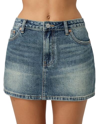 Betrodi Women Blue Denim Skirt Casual Low Waist Mini Jean Skirt Stretch Bodycon Low Rise Micro Cargo Skirt with Pockets (Basic Vintage, S)