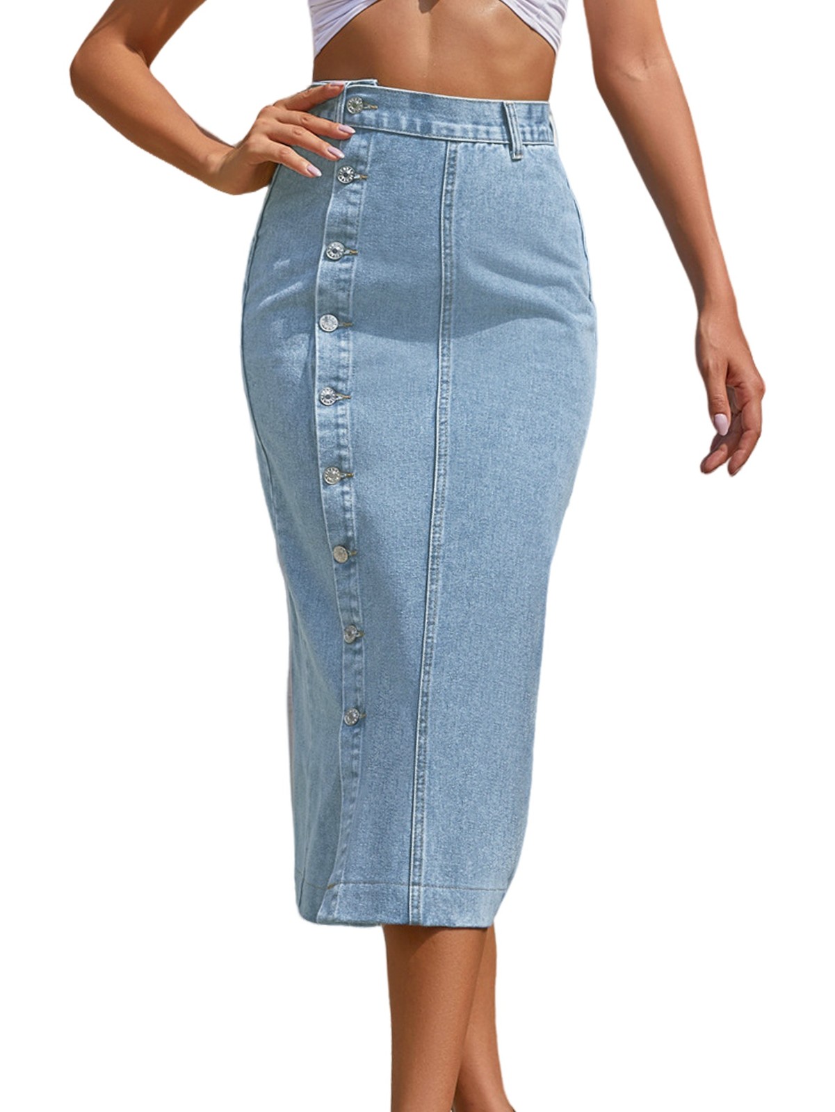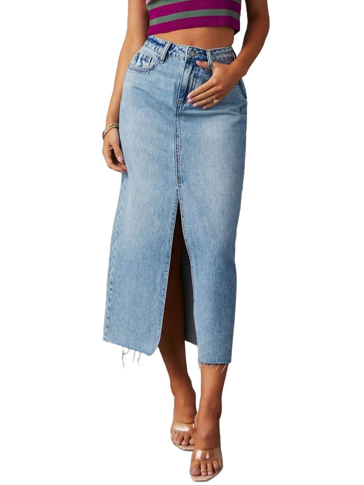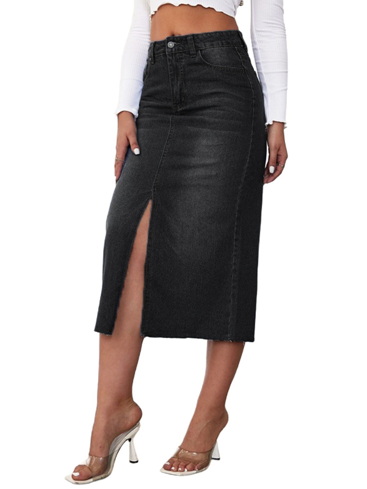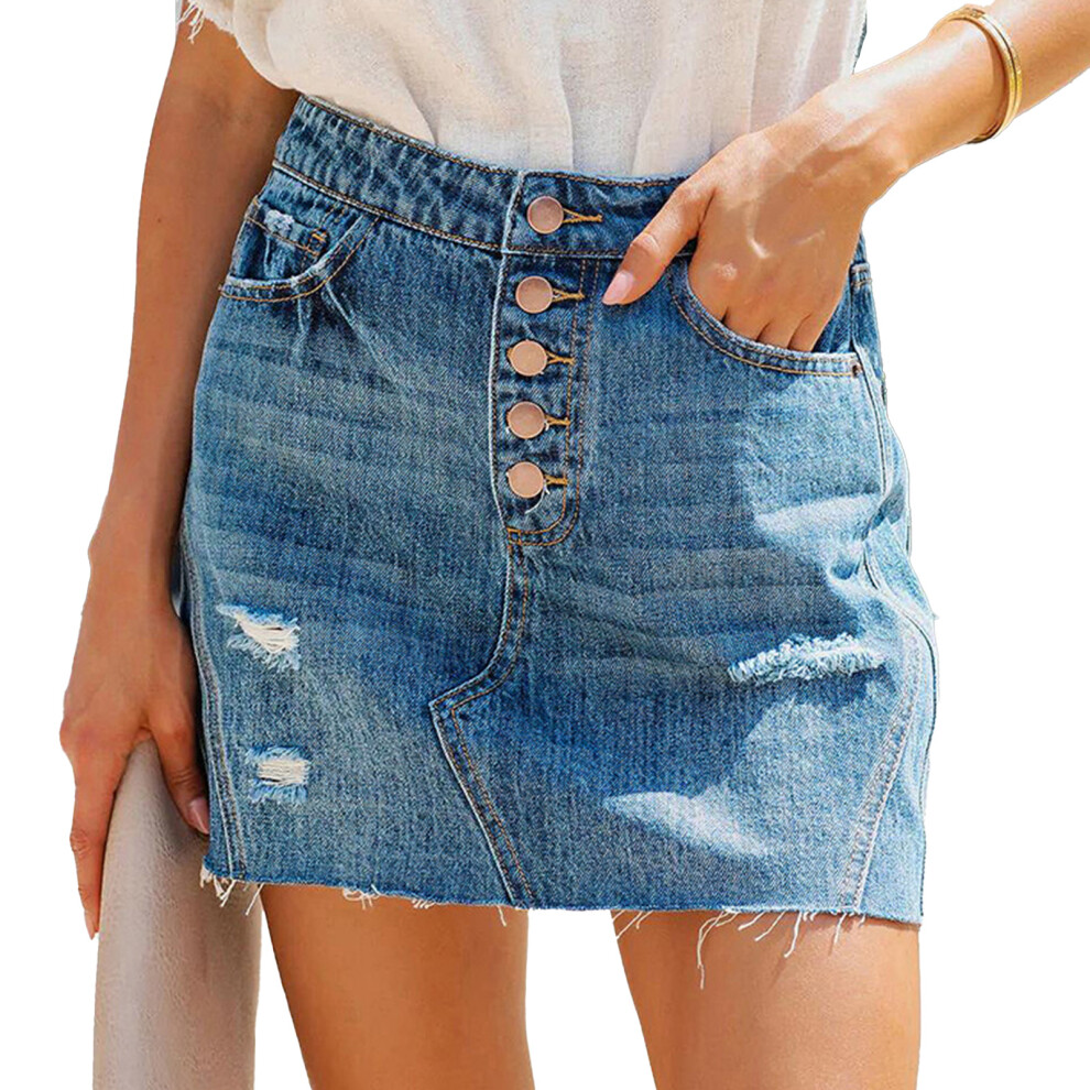 Womens Casual Slit Denim Midi Jean Skirt Stretch High Waist Frayed Button 7053