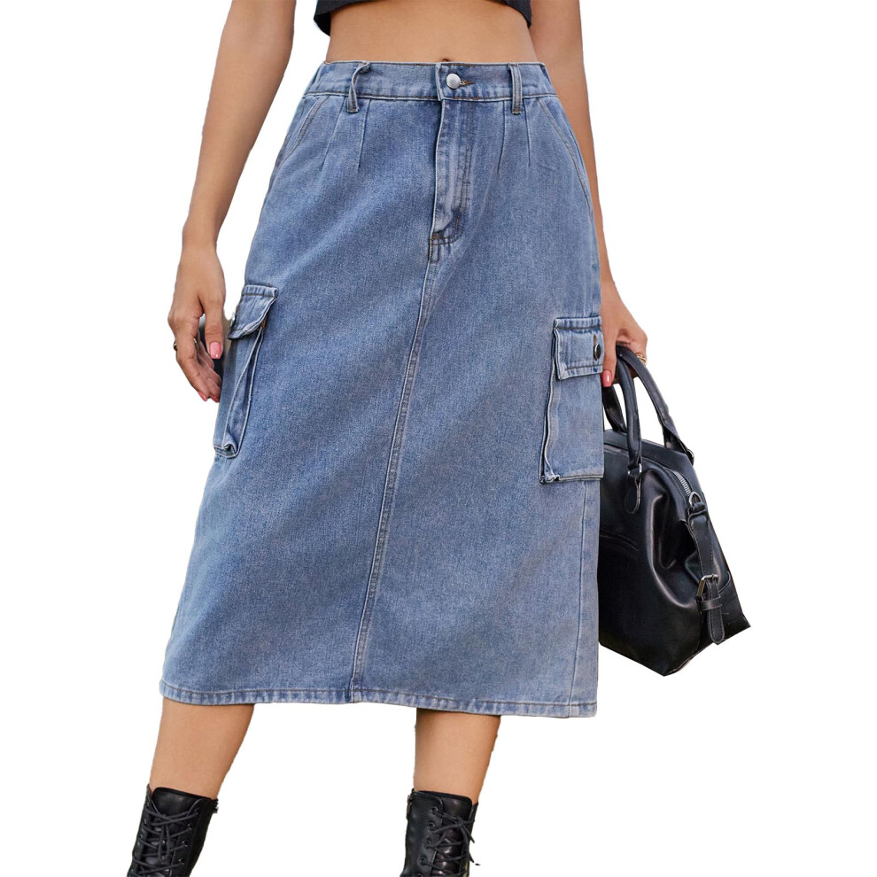 Denim Skirt For Women High Waisted Stretch Jean Skirt With Pockets Knee Length A Line Design Vintage Denim Midi Length Suitable For Daily Wear And