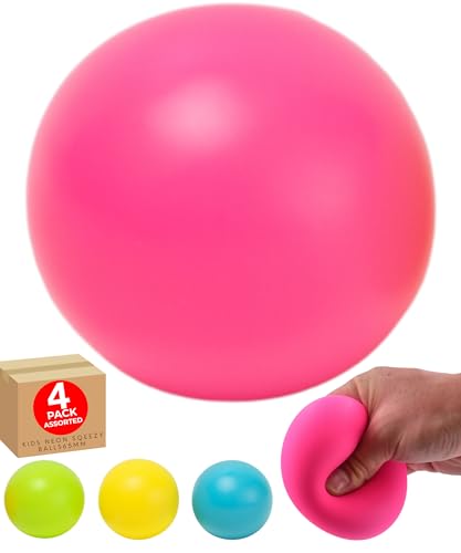 Squishy Neon Stress Ball Toy 4 Pack – Bright Squeeze Fidget for Sensory Play Tactile Stress Relief Soft Rubber Design for Kids Vibrant Colours Stretchy Handheld Stress Ball Electoys