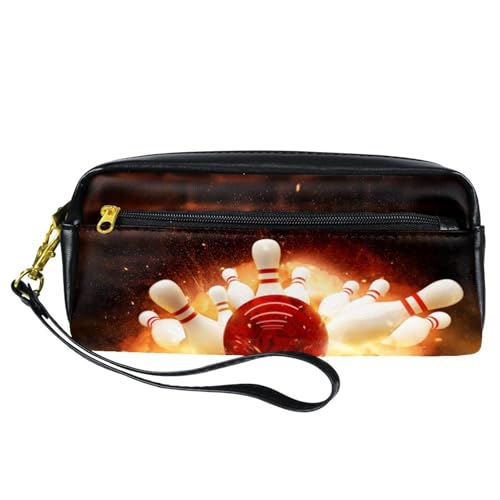 VAPOKF Bowling Ball Strike hit with Fire Print Pencil Cases, PU Leather Pen Bag Student Stationery Organiser Bag Makeup Pouch for Women Girls Boys Kids School Office Supplies