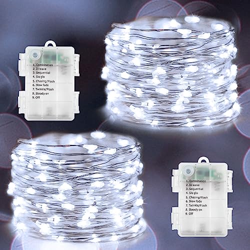 echosari 2 Pack Fairy Lights Battery Operated 100 LED 10M Silver Wire String Lights Auto Timer 8 Modes Waterproof Mini String Lights for Indoor, Garden, Yard, Fence, Wedding Decor (Cool White)