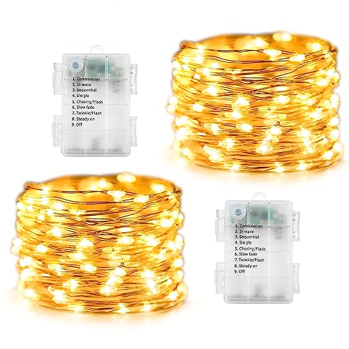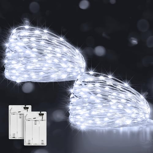 2 Pack Fairy Lights Battery Operated 100 LED 10M Silver Wire Starry String Lights Auto Timer 8 Modes Waterproof Mini String Lights for Outdoor Indoor Garden, Christmas, Wedding Decor(Warm White)