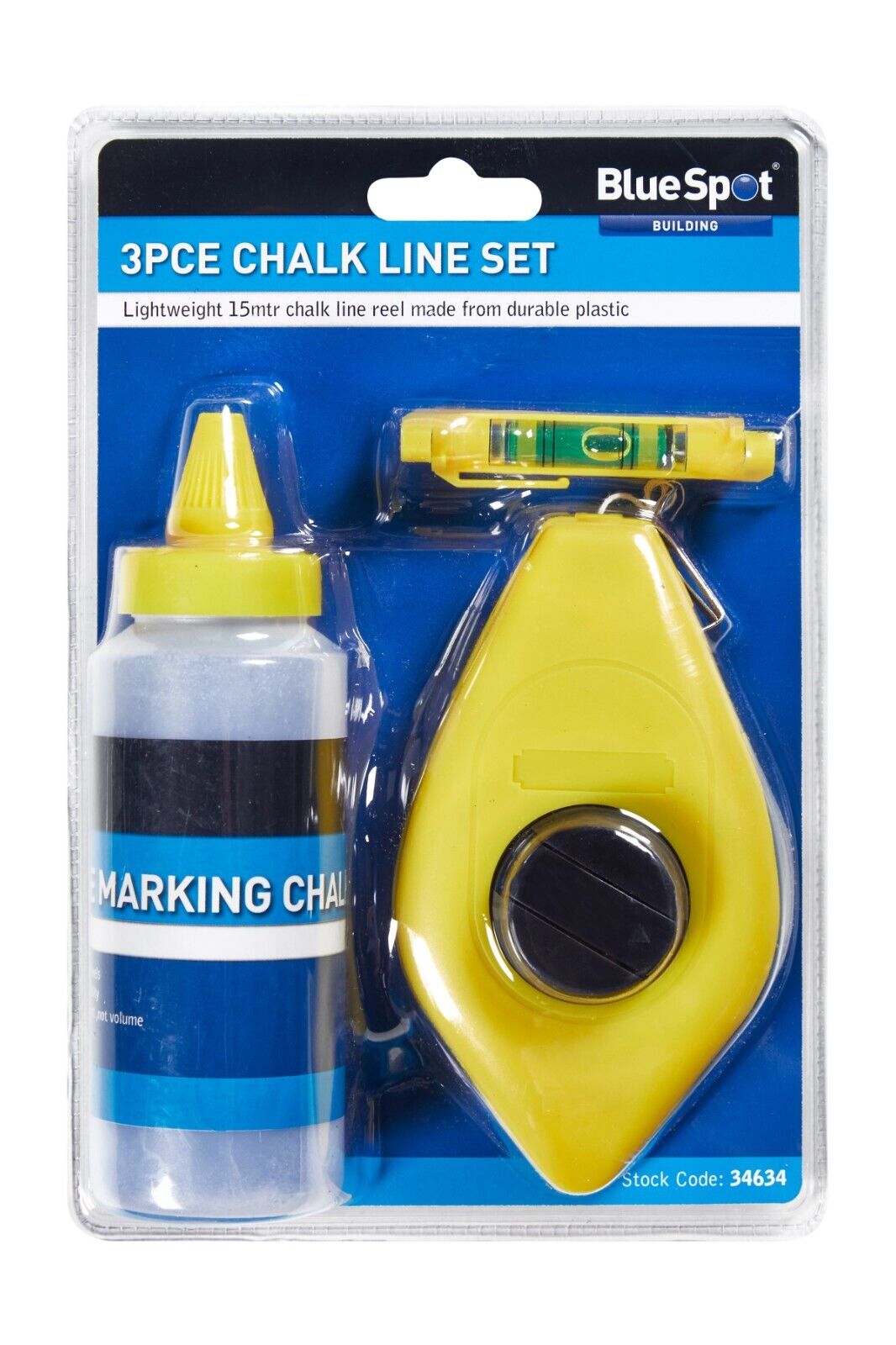 3pc Builders Blue Chalk String Line Kit Reel Set 15m (50ft) With Level 34634