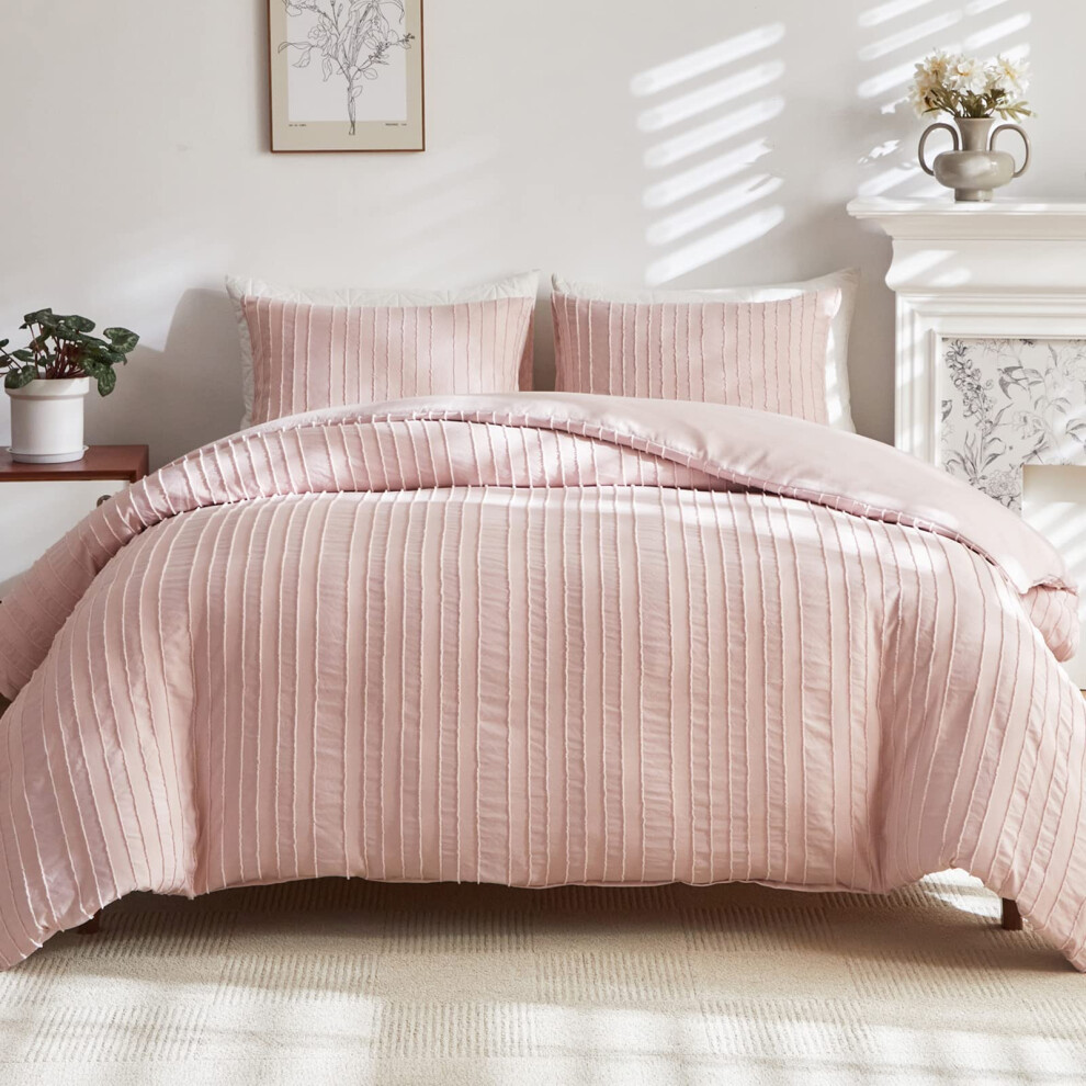 WARMDERN Pink Tufted Duvet Cover Set Queen Size Striped Textured Duvet Cover Boho Bedding Set 3 Pcs Ultra Soft Washed Microfiber Duvet Cover with Zi