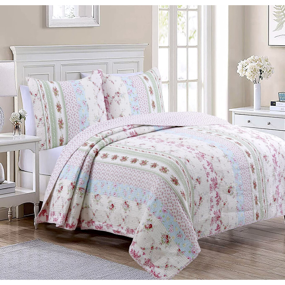 Cozy Line Home Fashions 100% Cotton Real Patchwork Floral Striped Cotton Reversible Quilt Bedding Set Coverlet Bedspread (Wild Rose King - 3 Piece)