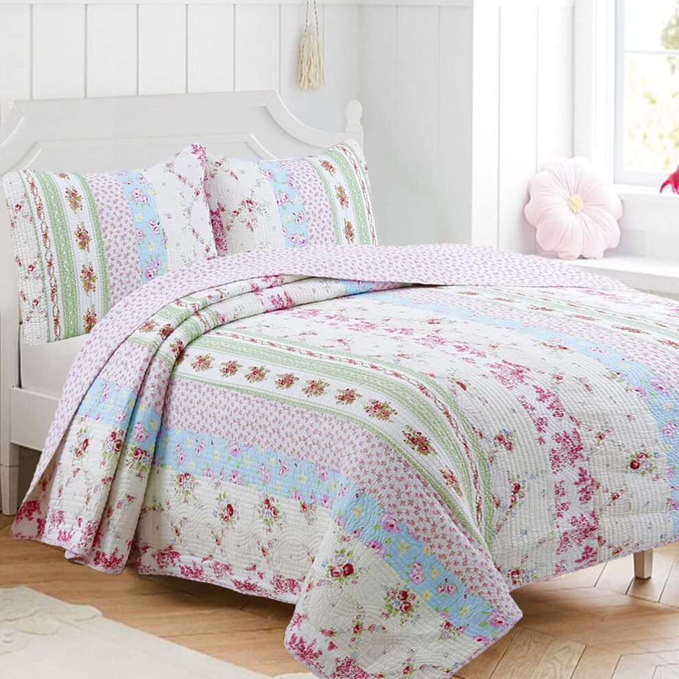 Cozy Line Home Fashions 100% Cotton Real Patchwork Floral Striped Cotton Reversible Quilt Bedding Set Coverlet Bedspread Wild Rose Twin - 2 Piece