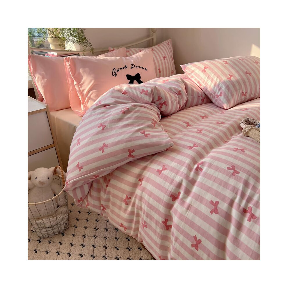 Striped Duvet Cover Set Full Size Pink Bowknot Kids Bedding with Zipper Closure and Pillowcases