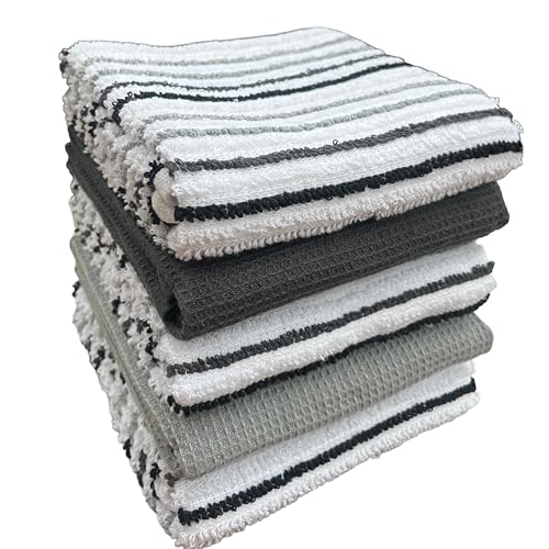 Olivia Rocco 5 Pack Striped Kitchen Tea Towels Cotton Super Absorbent Quick Drying Soft Ribbed Waffle Pot Towel, Silver