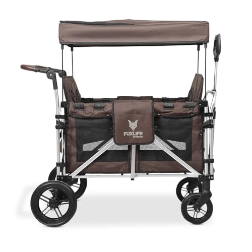 FUXTEC FX-CTXL900 Brown XL All-Terrain Folding Wagon for Kids to Sit In – 4-Seater Collapsible Stroller Wagon with Canopy, Safety Belts & Durable Steel Frame – Foldable Utility Cart for Families