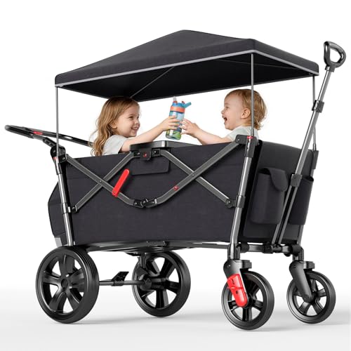 EVER ADVANCED Wagon for Kids to Sit in, Stroller Wagon for 2 Kids with Removable Canopy, Pull Along with Seats 5-Point Harnesses, Portable Push Pull Cart with Handle Bar Black