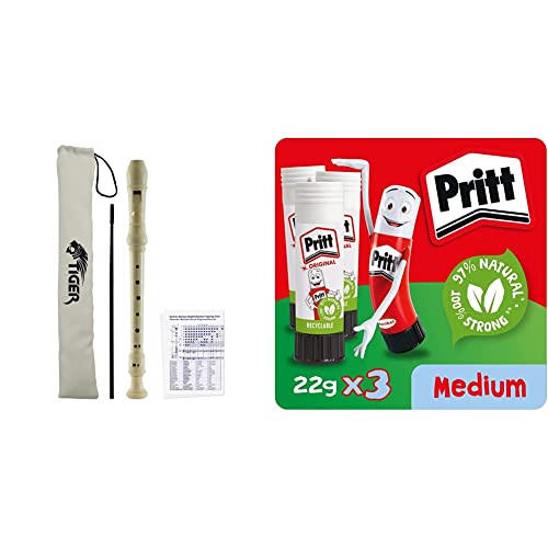 TIGER REC2-WH | Descant Recorder | Three Piece School Beginners Recorder & Pritt Glue Stick, Safe & Child-Friendly Craft Glue for Arts & Crafts Activities, Strong-Hold adhesive(Pack of 3)