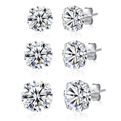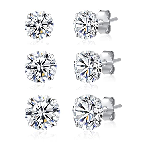 3 Pairs 925 Sterling Silver CZ Stud Earrings Set 6mm 7mm 8mm Cubic Zirconia Stud Earrings Men Women