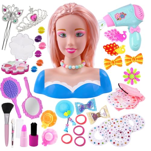 ENGINEMECH Kids Hairdressing Makeup Dolls, 39Pcs Pretend Play Half Action Figure Styling Hair Makeup with Hair Dryer and Hairpin Styling Head Doll Gift 2025
