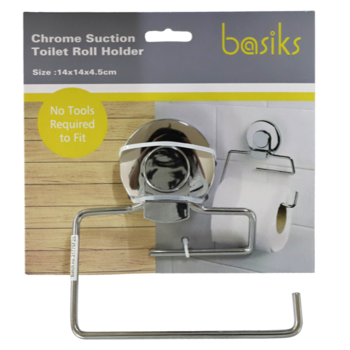 basiks Suction Toilet Roll Holder Wall Mounted Chrome Tissue Bathroom - Silver