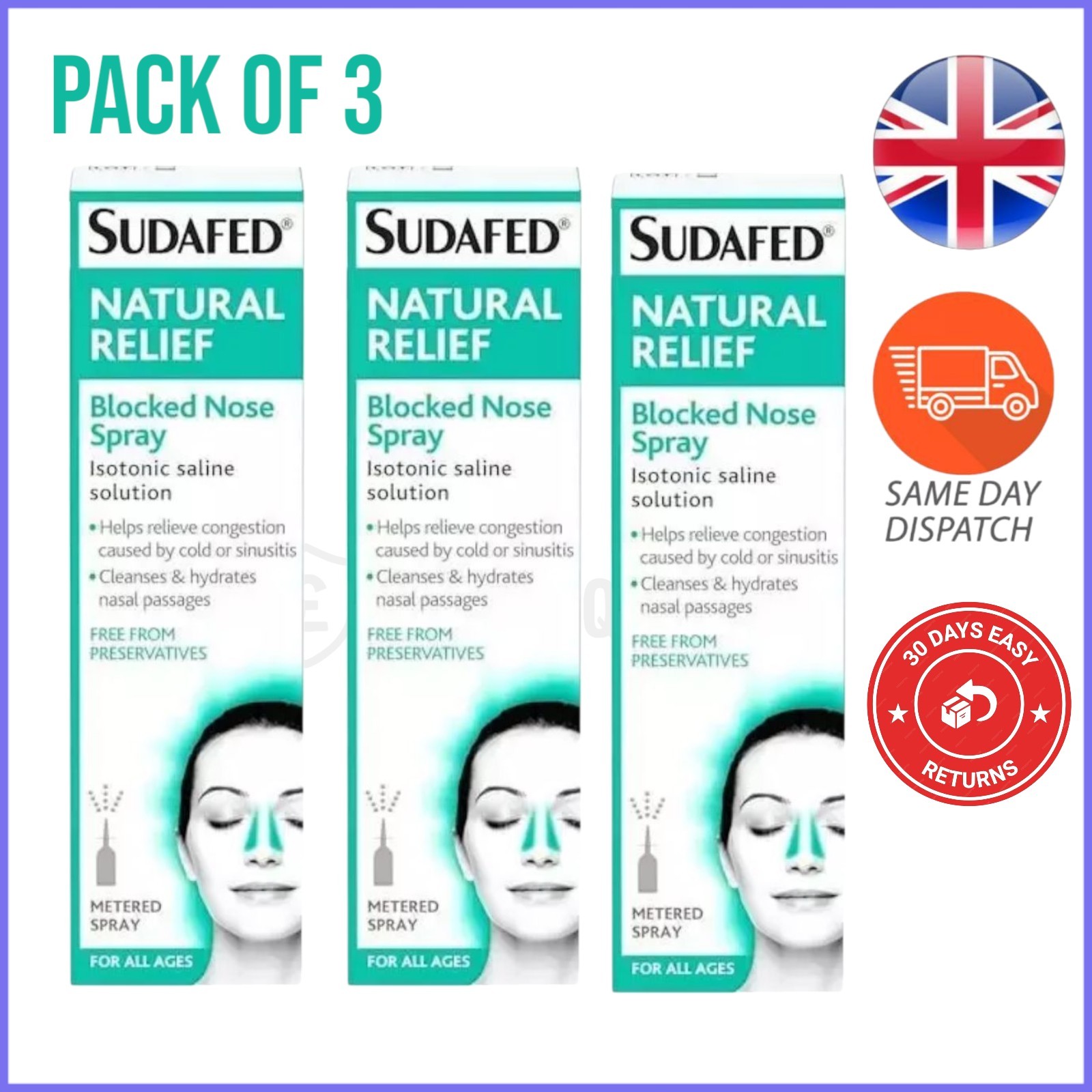 3 x 15ml Sudafed Natural Relief Blocked Nose Spray Nasal Spray (GREEN)