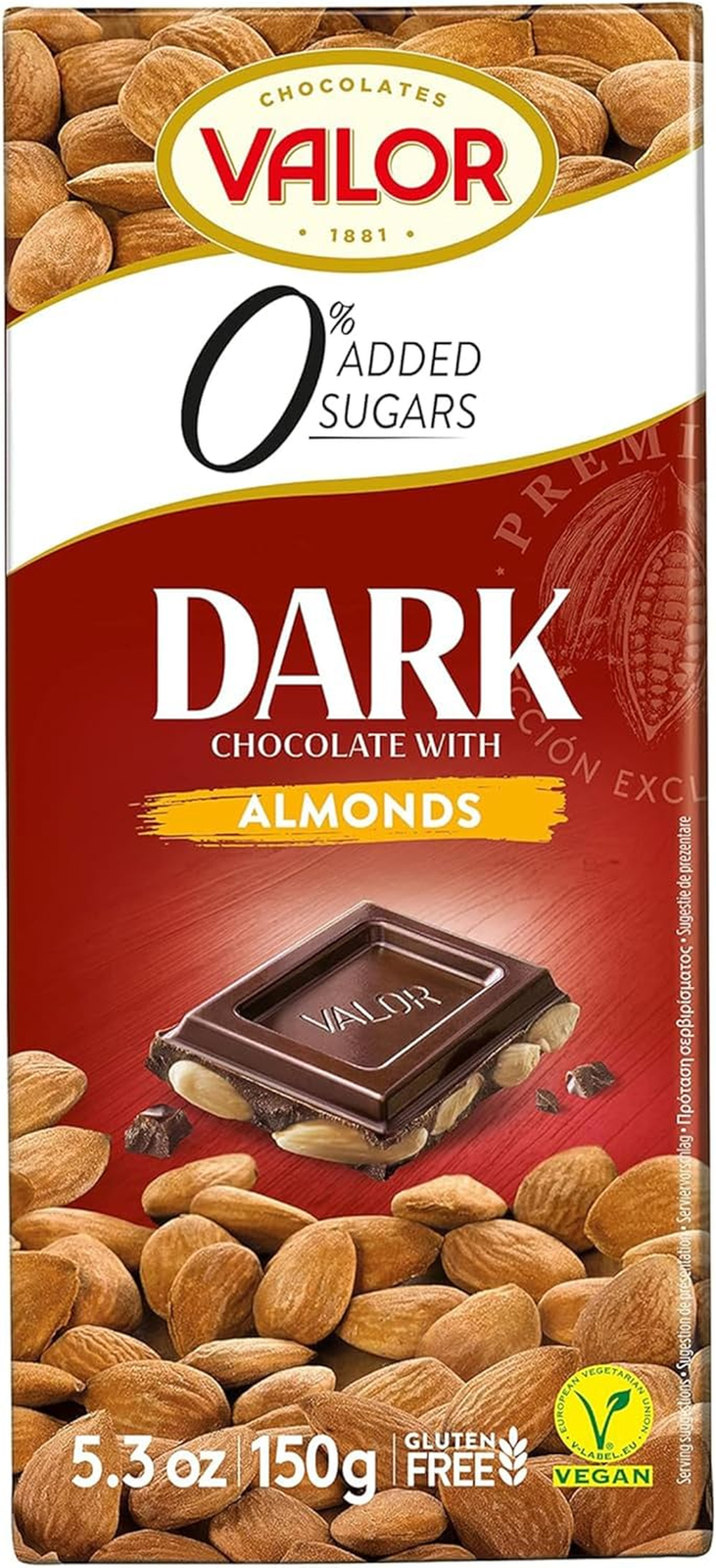 Valor Sugar Free Chocolate – Keto Low Carb Large Chocolate Bar - Diabetic Chocolate – Gluten Free, No Added Sugar, & Vegan Chocolate – Dark Chocolate with Almonds – 150g Bar (Pack of 2)
