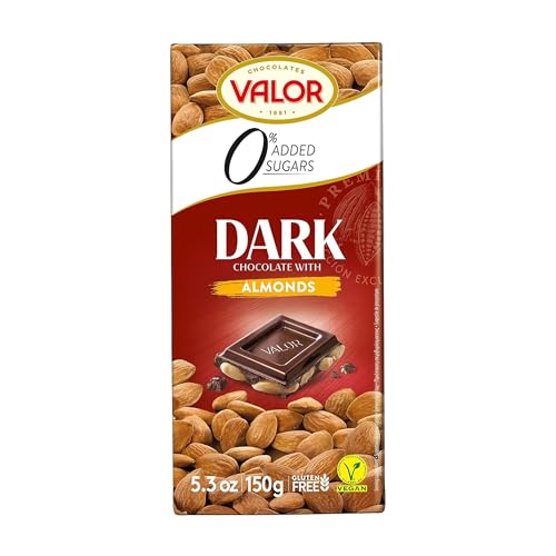 Valor Sugar Free Dark Chocolate Bar - Dark Diabetic Chocolate with Almonds - Delicious Sugar free made with Fine Cacao, Sweetened with Stevia, Gluten Free, Vegan, by Master Chocolatiers, 150g Bar