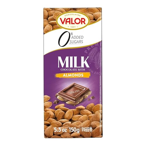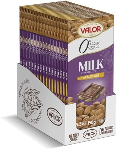 Valor Sugar Free Milk Chocolate Bar - Milk and Almonds Diabetic Chocolate Bar - Fine Cocoa, Sweetened with Stevia, Gluten Free, by Master Chocolatiers - All the Pleasure Sugar-Free, Box 14 150g Bars