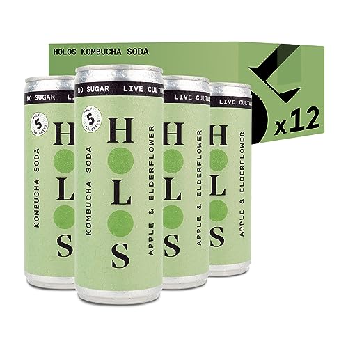 HOLOS Kombucha Soda - Apple & Elderflower Sparkling Kombucha - Vegan Sugar Free Drinks - Gluten Free Live Culture Drink - 12 x 250ml Kombucha Cans