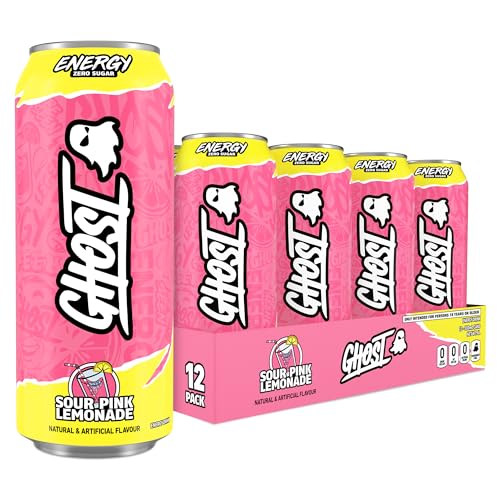 GHOST Sugar-Free Energy Drink - 12-Pack, Sour Pink Lemonade, 500ml Cans - No Artificial Colours - 160mg Natural Caffeine, L-Carnitine & Taurine - Gluten-Free & Vegan Fizzy Drinks