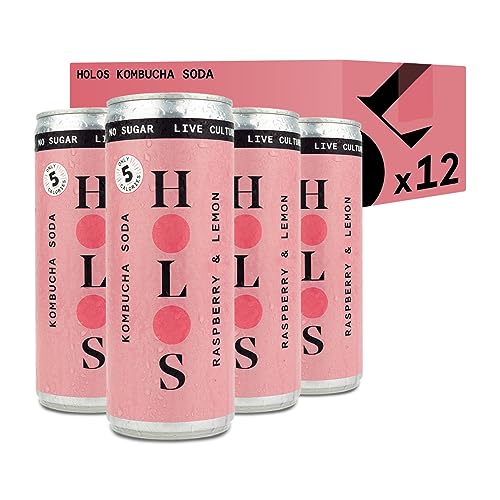 HOLOS Kombucha Soda - Raspberry & Lemon Sparkling Kombucha Drink - Vegan Sugar Free Drinks - Gluten Free Live Culture Drink - 12 x 250ml Kombucha Cans
