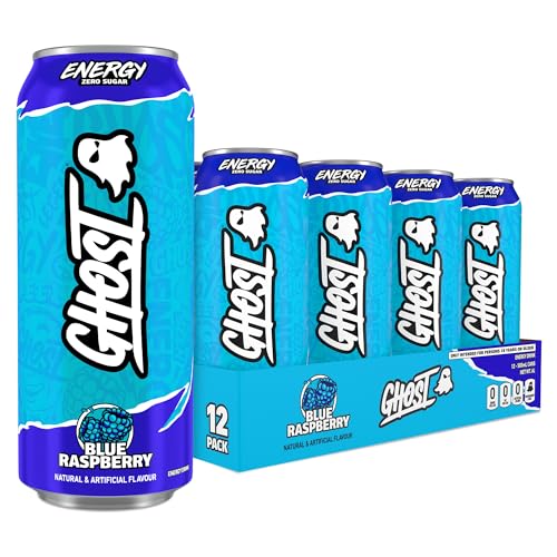 GHOST Sugar-Free Energy Drink - 12-Pack, Blue Raspberry, 500ml Cans - No Artificial Colours - 160mg Natural Caffeine, L-Carnitine & Taurine - Gluten-Free & Vegan Fizzy Drinks