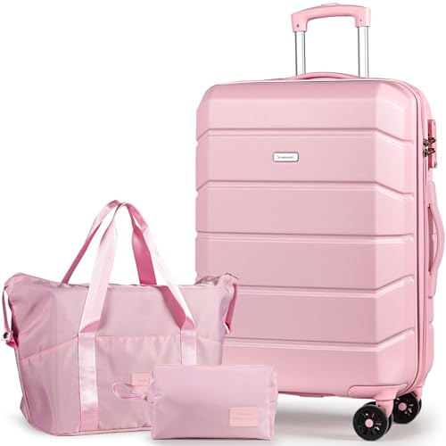 Tavoxda Suitcase Sets 3 Piece, Hard Shell Lightweight ABS Carry on Trolley Travel Luggage Set Spinner Wheels & TSA Lock with Travel Duffel Bag and Toiletry Bag, 24” Medium Set, Pink