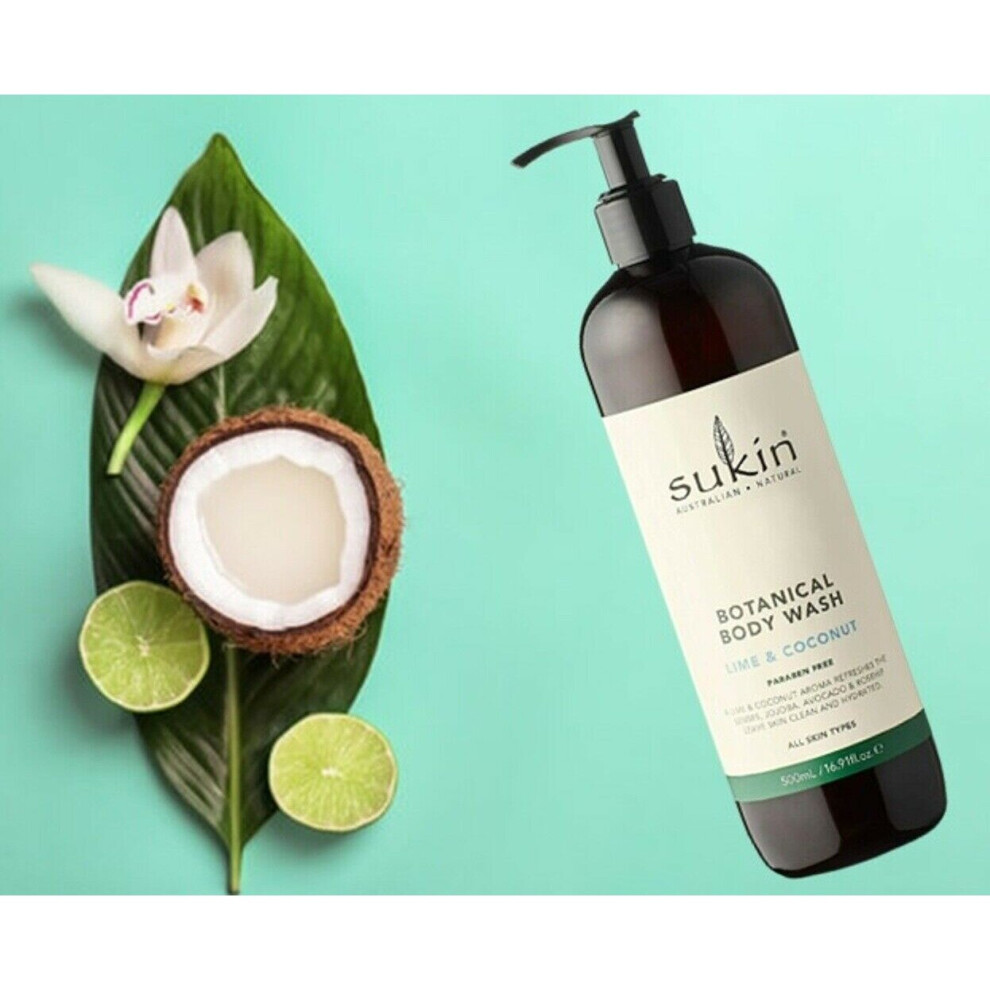 Sukin Soap-Free, Lime & Coconut Botanical Body Wash 500ml - stimulates the senses with zesty citrus & Coconut while leaving skin clean and fresh -