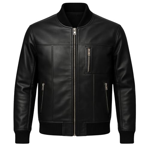 TRESSANO Mens Black Smart Biker Motorcycle Summer Lightweight Casual Bomber Leather Jacket, Black - Design 2, Medium