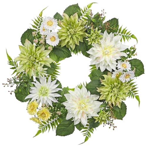 Oairse 24'' Artificial Dahlia Flower Wreath for Front Door Large Silk Dahlia Daisy Floral Wreath Fake Hanging Greenery Wreaths for Spring Summer Home Wall Window Mantle Outdoor Porch Décor