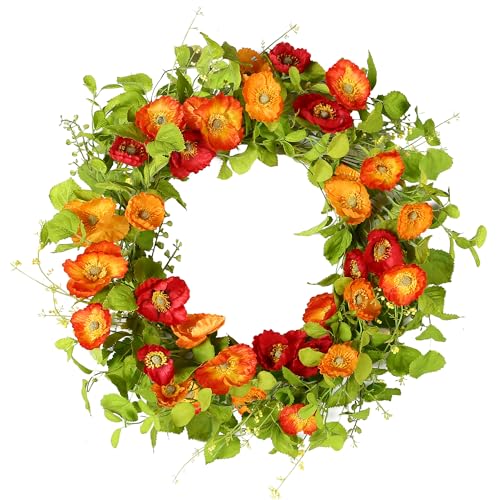 YNYLCHMX 18" Spring Summer Wreaths for Front Door, Artificial Floral Wreath with Poppy Flowers Green Tea Leaves, Green Foliage Wreath for Wall Window Farmhouse Party Holiday Home Decor