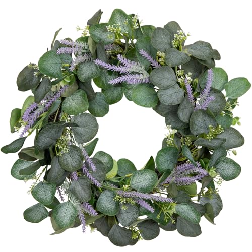 Briful 16" Artificial Eucalyptus Wreaths Spring Wreaths with Lavender Stem for Front Door, Faux Lavender Summer Wreath Door Wreath for Window Wall Festival Décor