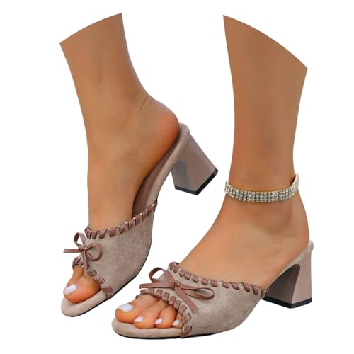 LDXEQIZ Large Size Slippers Women's Elegant Sandals With Block Heel Vintage Suede Slippers With Bows 2026 Open Toe High Heels Summer Evening Dress Shoes For Party(Beige,6 UK)